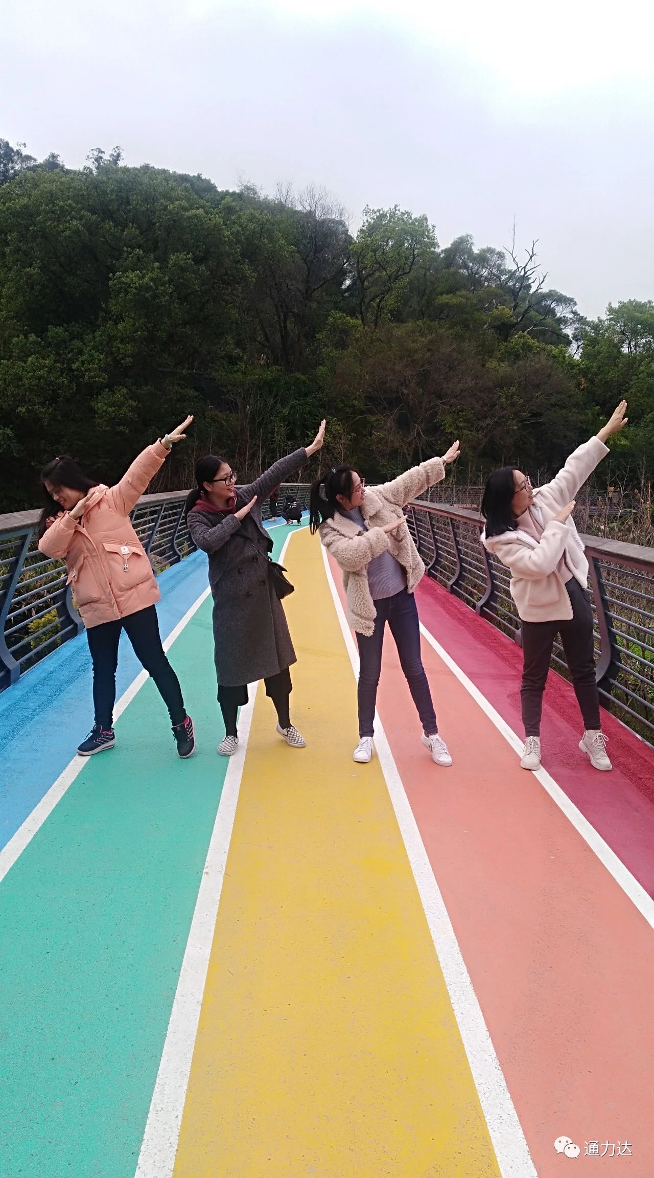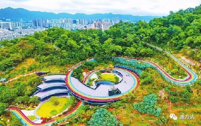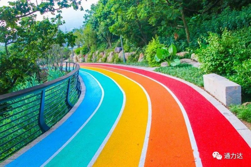 不得不說,以紅黃橙藍綠五色始出的它,在蔥翠蒼綠的山間蜿蜒而過,如同霞帶系在山間般美輪美奐。從空中俯瞰,隱在濃密林蔭中的彩虹步道顯得更加亮眼,看著這些五顏六色的搭配像極了一支巨型且甜甜的“棒棒糖”,讓原本平凡的步道變得甜蜜靚麗了許多!各位女神們散步在“彩虹路”上滿臉是甜蜜的微笑,活像一朵盛開的玫瑰花。